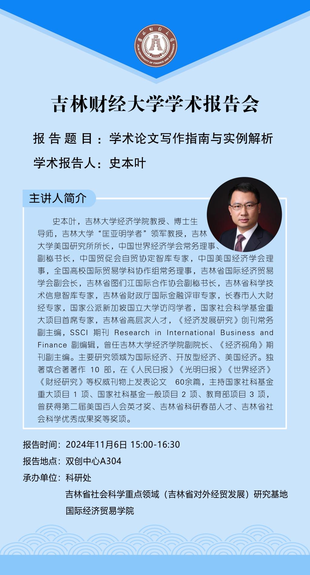 报告时间:2024年11月6日(星期三)15:00报告地点:创新创业实训楼A304主讲嘉宾:史本叶主持人:杨立国 主讲嘉宾简介:史本叶,吉林大学经济学院教授、博士生导师,吉林大学“匡亚明学者”领军教授,吉林大学美国研究所所长,中国世界经济学会常务理事、副秘书长,中国贸促会自贸协定智库专家,中国美国经济学会理事,全国高校国际贸易学科协作组常务理事,吉林省国际经济贸易学会副会长,吉林省图们江国际合作协会副秘书长,...