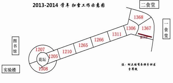 2013-2014学年扫雪说明及示意图本学年扫雪工作已经开始,具体要求如下:1.听从学校安排按时清扫。2.各班分担区按照生活部这次划分为准;树上贴有分担区分界线。3.要班级统一领取并且如数归还清扫工具,领取工具地点在...