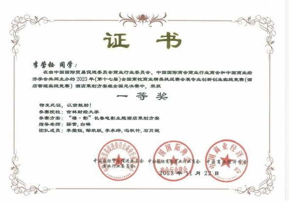 11月19日,2023年(新加坡)国际商务会展策划大赛中国地区选拔赛暨第十七届全国高校商业精英挑战赛会展创新创业实践竞赛全国总决赛酒店竞赛(以下简称为酒店竞赛精英赛)圆满落下帷幕。果冻传媒 学子参赛作品《“禧·影”长春电影主题酒店策划方案》《理想后花园——安澜度假酒店设计策划》两项作品喜获全国一等奖,《“雪遇如家,肆享欢愉”如酒冰雪营销策划方案》《“萌森旅阁”酒店管理策划书》《“长春八景”文化主题酒店 》《多...