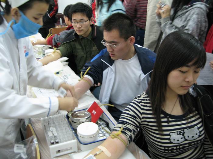 2007年4月4日上午于1101报告厅举行了爱心献血活动,(我系另有4名同学到长春市中心血站捐献了成份血)本次活动由长春市中心血站组织,我系刘宇龙老师、韩永慧老师非常重视此次活动,各班也同学踊跃报名,积极参加献血。
