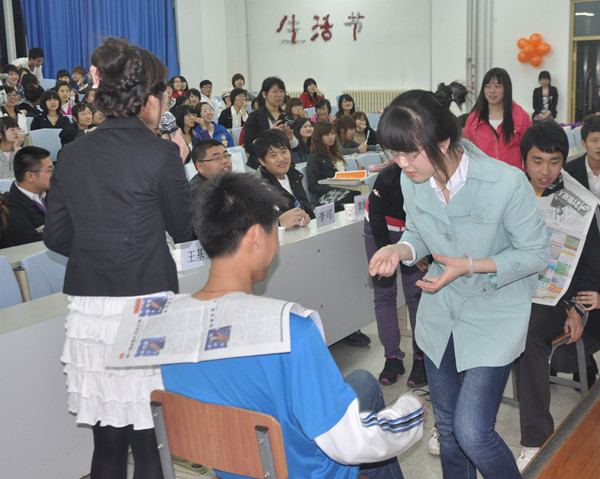 “你来比划我来猜”是嘉宾老师和同学的互动环节,于游戏间拉近了老师和同学之间的距离,他们之间默契的配合将比赛推向了一个新的高潮。本次生活节还创新地增加了一个神秘环节,每个班级会派出一男一女两名同学参加,由工作人员将女生眼睛蒙住,女生在看不到的情况下要将一杯酸奶喂给坐在椅子上的男生,比赛中,台下加油喝彩声不断,气氛十分热烈。
