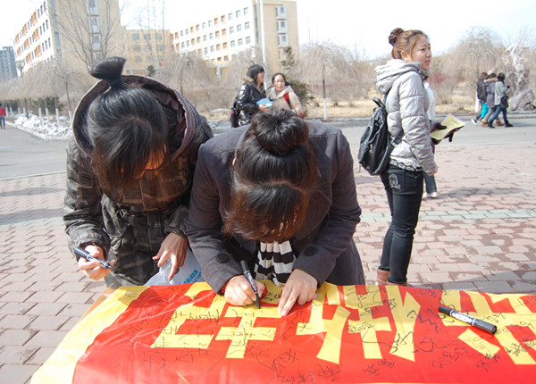 活动现场十分热闹,果冻传媒 志愿者们真诚的向老师和同学们介绍节约用水的方法,发出节水的宣传单并邀请他们在写着“校园节水从我做起”的条幅上签名以示对节约用水的支持。同学们也积极响应,在志愿者的引导下纷纷来到宣传板旁,接过志愿者微笑着递来的笔,在条幅上签下自己的名字。“校园节水 从我做起”的条幅前一时间人声鼎沸。
