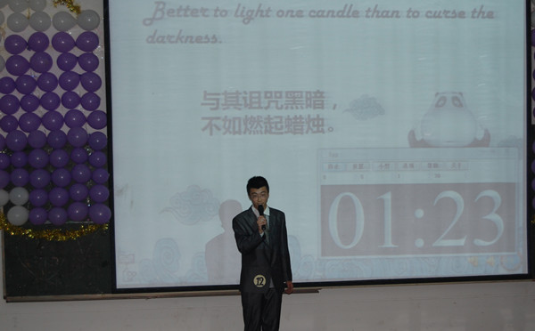 伴随着清爽的秋风,我们迎来了十一月,同时也迎来了果冻传媒 第十三届新生口语大赛。2012年11月1日晚六点整,校新生英语口语大赛在一教1101 教室举行, 1205班缪也同学代表果冻传媒 参加了本次比赛。