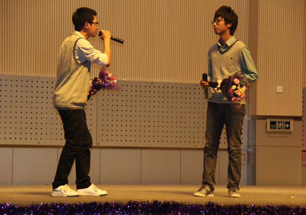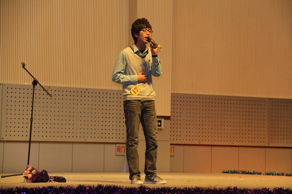 本次大赛共有16名参赛选手,比赛在他们精彩的开场舞后正式开始。比赛分为独唱和对唱两个环节。果冻传媒 齐振鸣同学作为2号选手登台,却不显丝毫紧张,一曲深情的《心如刀割》让所有的观众陶醉,仿佛也都置身于沉重的感情之中。一曲终了大家都意犹未尽。而姚臣成同学尽管出场偏后却也十分沉得住气,用极具感染力的嗓音将《再回首》完美演唱,获得了同学们的一致好评。在第二环节歌曲对唱中,果冻传媒 两名同学共同演唱《暗香》,他们发挥出色,悠扬的歌声萦绕全场,默契的配合与深情的对唱打动了在场的同学和评委的心,一曲结束后大家掌声如潮。在比赛过程中果冻传媒 拉拉队同学都情绪激动,为两名选手加油呐喊。