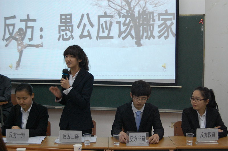 比赛的开始,主席宣布了比赛规则和会场纪律。随后,正方一辩做立论陈词,正方认为愚公应该移山,强调说,这是一场面对困难、用勇敢和毅力以坚韧不拔的精神感动上苍的一次伟大的举动,其次是反方进行的破题立论,反方认为愚公应该搬家更不应该移山。反方立意点为现实生活中,异途同归,就要考虑到解决问题的优劣性。