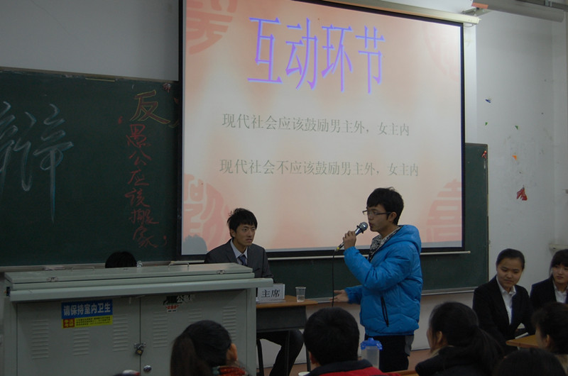 历经了双方针尖麦芒旗鼓相当的攻辩后,接下来的是最具挑战性的巅峰对决,即自由辩论阶段,双方据理力争,难分伯仲。接着又迎来了的是评委提问环节。嘉宾赵明娇学姐对本次比赛进行了精彩点评。在紧张之余的互动环节,12级同学就现代社会是否应该鼓励男主外、女主内进行了趣味辩论。国经辩论表演赛在一片欢乐中完美落幕。