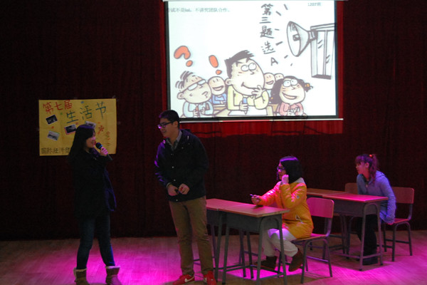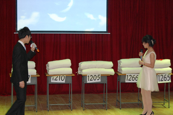 紧接着另一个教室内叠被子比赛开始,被子在同学们的手下叠得有棱有角。学生手舞足蹈游戏环节,描述的同学动作搞怪连连,精彩出奇,大家连连起哄。不NG环节,嘉宾与同学配合,嘉宾先读颜色,然后同学在开始做一系列的甩纸条,背句子,五连拍,跳跳绳,于游戏间拉近了老师和同学之间的距离。最后是紧张刺激风险题环节,这个环节可谓是勇敢者的游戏,不同的分值的题使各班最终成绩有了大变化。最终颁奖环节之前还有大一至大三的同学倾情献唱和神秘的抽奖环节。