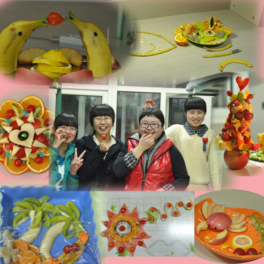 同学们对此次活动充满期待,早早地准备好水果,构思好水果拼盘的设计,互相商量、合作密切,经过一段时间的奋斗,大家的作品完美呈现在眼前,作品风格各异,别具特色。有“荷塘月色”――橘子、苹果等组成的水果拼盘,五颜六色,苹果拼出的小龟更是别具创意。有“果缤纷”――香蕉、猕猴唐、小西红柿、甜橙等组成的水果蛋糕的形状,漂亮极了。“满载而归”更是凸显童趣,由火龙果做成等做成海盗船的造型,小西红柿,金桔等就是海船载回的宝物,别具特色。