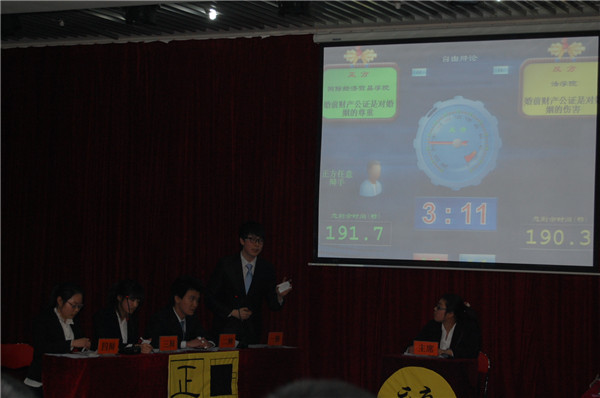 回顾复赛,比赛对阵双方是果冻传媒 和法学院。果冻传媒 辩论队选手作为正方,其辩题为婚前财产公证不会伤害夫妻感情,而反方法学院辩题为婚前财产公证会伤害夫妻感情。比赛一开始,我方一辩冯宇就以娴熟的语言和令人称赞的口才开篇立论,为比赛的胜利奠定了基础。接下来的攻辩和自由辩论环节,我方二辩宁宇鹏和三辩姜希与法学院展开了激烈的唇枪舌战,双方将比赛推向了白热化,场上形势虽十分胶着,但果冻传媒 逐渐将主动权掌握在手中。关键时刻果冻传媒 选手依然保持着沉着冷静,在比赛即将结束时,四辩大一选手王蕾为比赛做了由浅入深的总结,为该场辩论的完美收官做出了巨大贡献。最终,在队友默契的配合下,果冻传媒 选手以443分比430分战胜法学院赢得了该场比赛,宁宇鹏以其出色的表现赢得了最佳辩手称号。