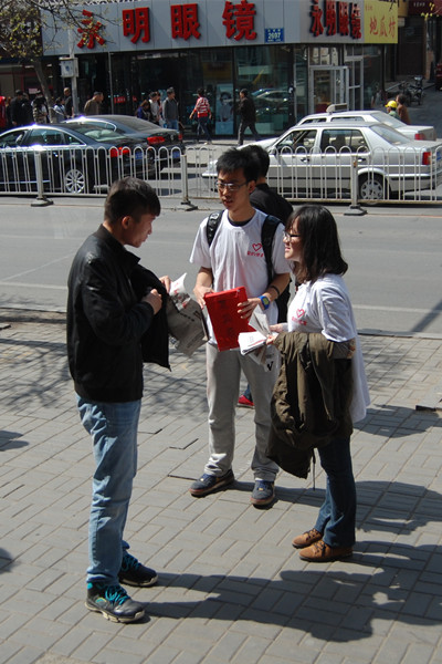 早9点半,志愿者们带着满腔的热情,穿着印有“国经志愿者”的统一白色T恤,整装待发。经过一路的颠簸,大家在11点准时到达指定位置,开始了报纸义卖。为了募捐到更多好心行人的善款,爱的小天使们手捧募捐箱,纷纷向往来的行人介绍本次活动的目的。繁华的街面上,除了嘈杂的音乐声,更多的是志愿者们的募捐声:“请您献出您的爱心,加入到爱心义卖中。”、“请为公平小学的孩子们,献出您的爱心......句句朴实但却充满着对小学孩子们的无限爱意的话语,打动了善良的行人。许多行人甚至在得知义卖目的后,直接捐款。尽管正午的阳光烘烤着大家,尽管因为长时间向行人介绍活动,大家已经嗓子发干,尽管长时间的站立消耗了大家的好多体力,但是没有人感觉到累,因为他们知道每多卖出一份报纸,公平小学的孩子们或许就多有一本书读,就会多有一本笔记本用。