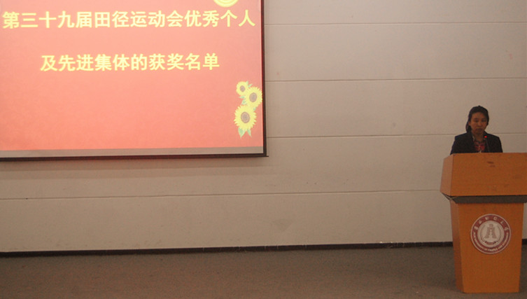 大会开始,邸思润老师首先对为运动会辛勤付出的运动员、学生会各部门以及积极参与的同学们表示鼓励与赞扬。随后,播放了同学们在运动会上各展风采的视频短片。接着由韩永慧老师宣读了运动会表彰决定后,党总支书记彭栋春、副书记赵钺、团委书记韩永慧先后为荣获最佳策划奖、最佳创意奖、最佳风采奖、最佳组织奖、最佳奉献奖、精神文明奖、优秀运动员、突出贡献奖、最佳运动员的先进集体和先进个人代表颁奖并合影留念。获奖的体育部、文艺部、社团部代表以及运动会上独得37分获得突出贡献奖的张秀彩同学先后发表了获奖感言,表示一定认真总结经验,在下届运动会争取更好的成绩。随后刚刚被学校党委任命到果冻传媒 工作的党总支书记彭栋春发表了热情洋溢的讲话,他充分肯定了同学们在运动会上所取得的成绩,感谢同学们为运动会所付出的辛勤努力,对为运动会做出突出贡献的同学提出了表扬。彭书记表示,虽然我们在此次运动会中没有取得突出的成绩,但同学们都充分发挥了自己的优势与特长,都尽力了。令人欣喜的是本届运动会上涌现出一批新生力量,他希望同学们能“走出寝室,走向操场”,期待着未来看到同学们取得更好的成绩。大会的最后,党总支副书记赵钺做了总结发言,他充分肯定了同学们在运动会上所表现出来的顽强拼搏、无私奉献的精神,然后从三个方面对本届运动会做了总结:筹备工作及时到位;刻苦训练、顽强拼搏;团结协作、顾全大局。他希望同学们通过本届运动会认真总结经验,凝心聚力,再接再厉,争取在下一届运动会取得更好的成绩。同时希望同学们能够将运动会拼搏进取的精神带入学习生活中,在各方面不断争创佳绩。