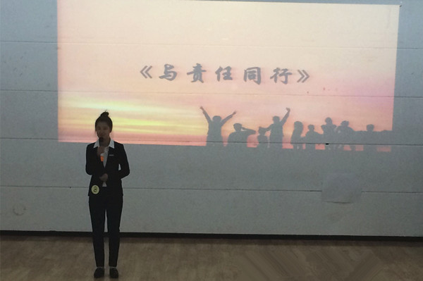 第三环节是以青春心语为主题的演讲,果冻传媒 大三同学梁艳林带来的《与责任同行》的主题演讲结合她自己的青春奋斗故事,她自信而动容的表现为她赢得了首届吉财吉财青年说中文演讲比赛的最佳人气奖。