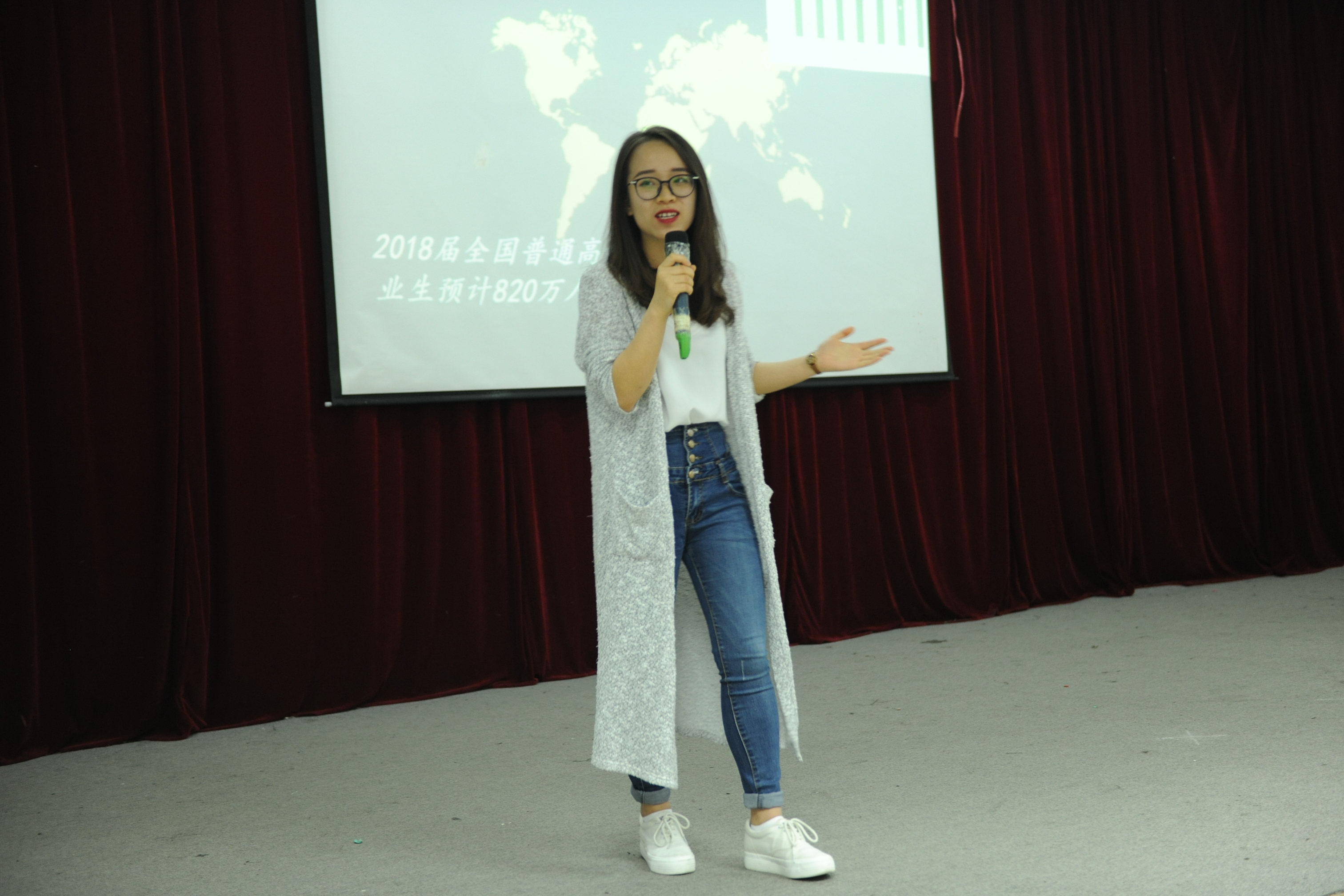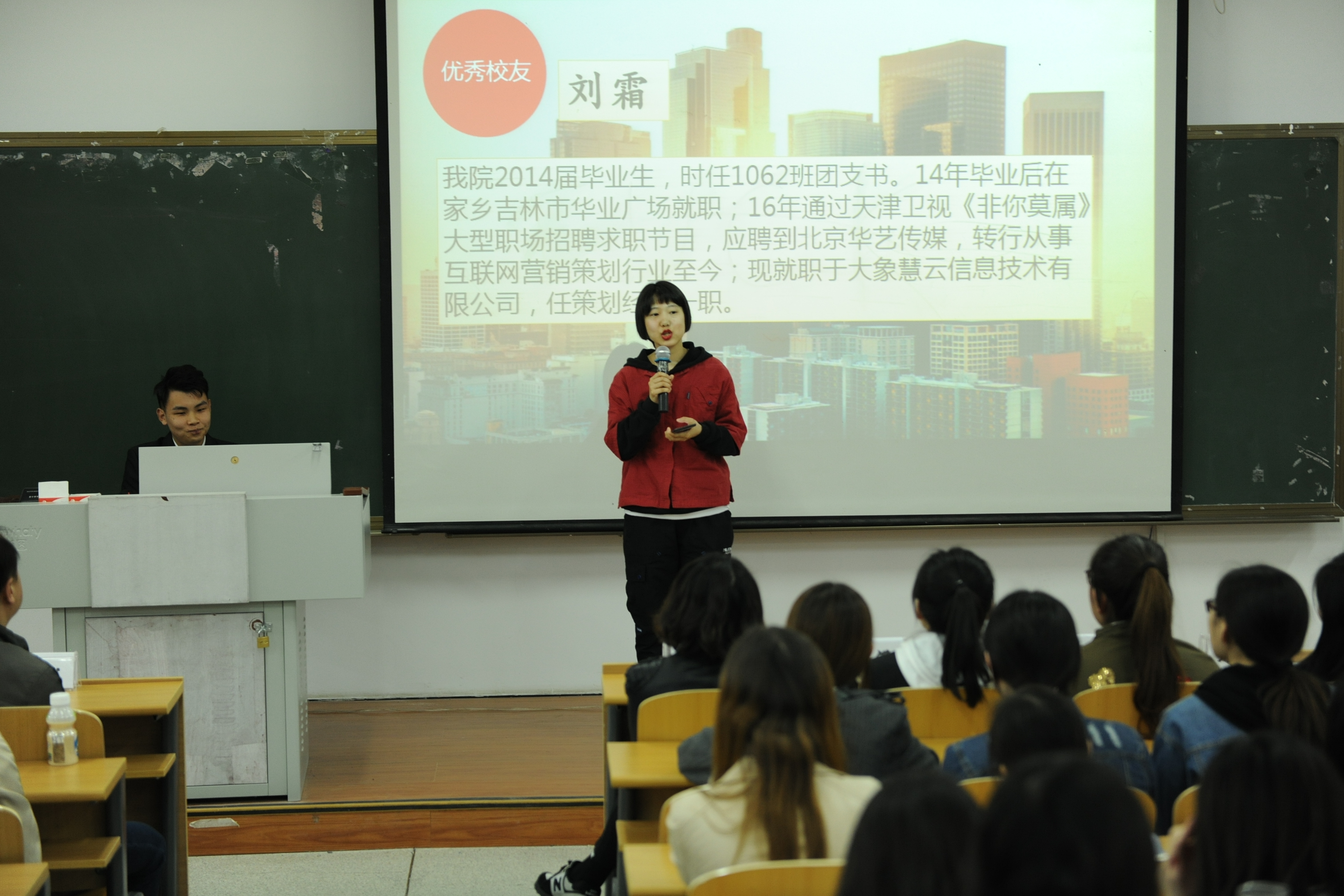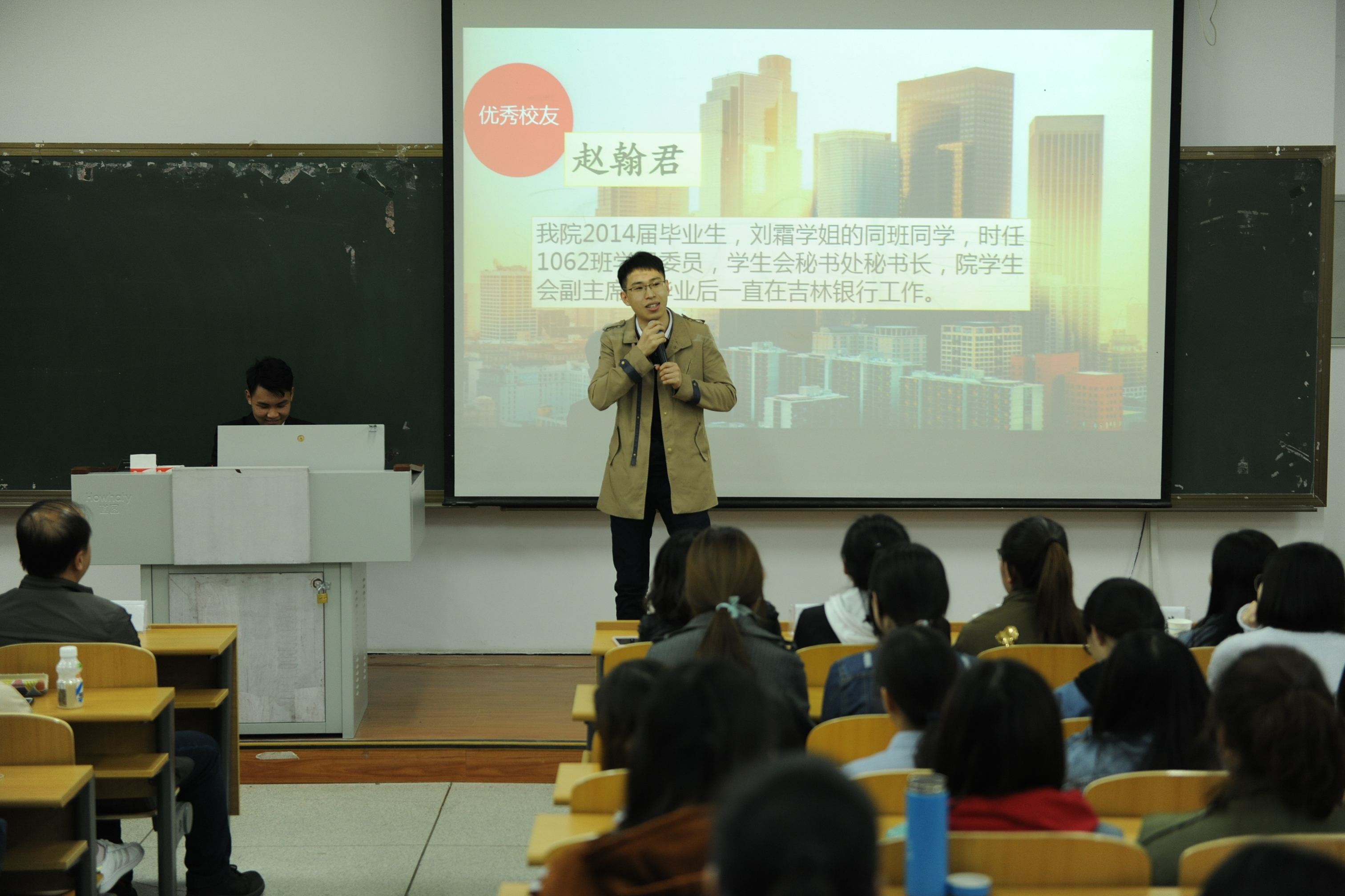 本次活动由“经验共享”和“答疑解惑”两个环节构成。第一环节经验共享,五位优秀的学长学姐为同学们分享了考研和求职过程中的各种经验与技巧。在这一环节中,两位2014届毕业生校友与大家分享了他们的求职和成长经历。国际经济与贸易专业毕业的刘霜校友于2016年在天津卫视的大型职场招聘求职节目《非你莫属》栏目中求职成功,现就职于北京大象慧云信息技术有限公司从事互联网营销策划工作。这次她利用出差的机会特意主动申请回母校以《世界不会因为视野变窄而变小》为题介绍自己成功的求职经验。刘霜用风趣幽默、极富感染力的语言,分享了她的求职经历,为学弟学妹们传经送宝。她鼓励同学们要不断的给自己充电加油,树立自信心,在面试中努力展现真实的自我和优势。国际经济与贸易专业毕业的赵翰君校友现就职于吉林银行,他与同学们分享了应聘银行报考、笔试、面试的流程、相关要求以及他成功考取银行的宝贵经验。介绍了目前金融行业的现状、发展前景以及银行的具体业务,尤其详细介绍了与国际经济与贸易专业相关的国际业务,使同学们加深了对金融行业的了解。