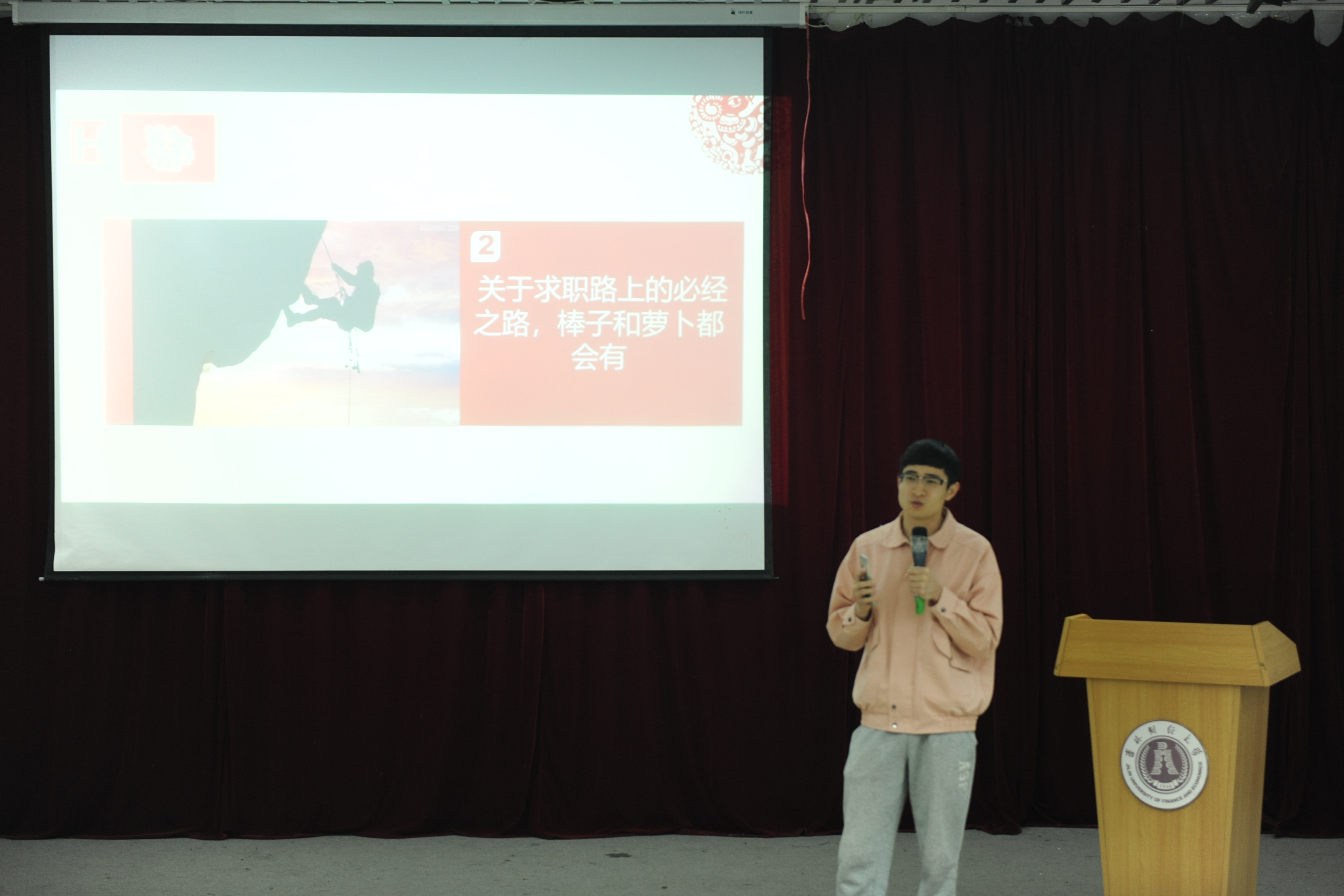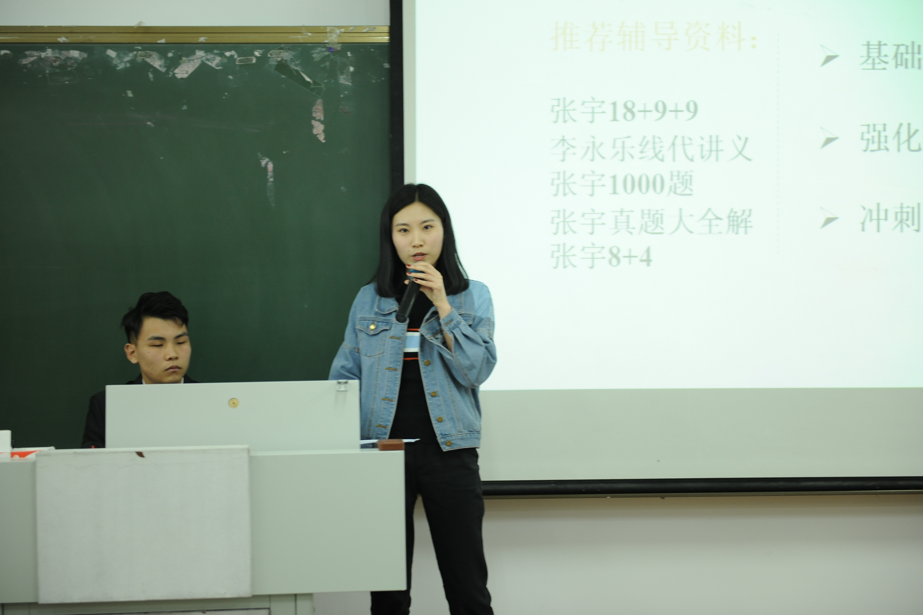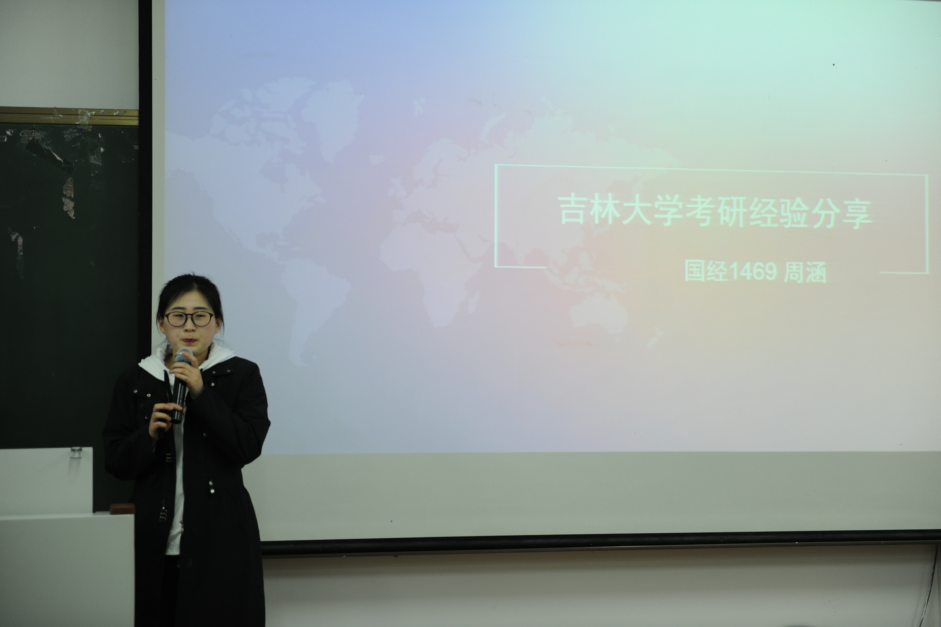 今年的应届毕业生武鑫(保研北京交通大学)、刘紫薇(考取东北财经大学)、周涵(考取吉林大学)详细讲解了有关考研的流程及复习方法,提示同学们要做好时间规划,调整心态,珍惜学习时光。他们还解答了同学们提出的一些个性化的提问。