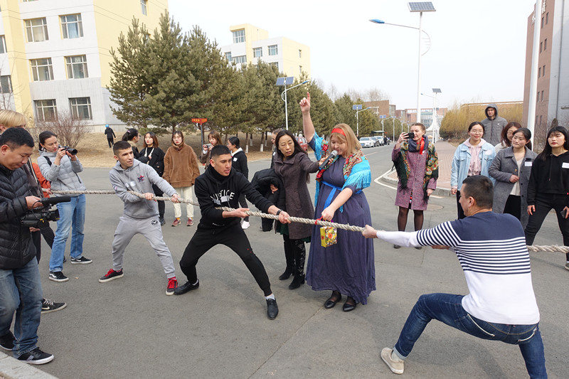 俄语教研室贾燕老师专业、幽默的讲解指导下,中外学生混合编组共同进行了“吃货接力、人体解题、钻树洞、男女生跳绳拔河”等一系列游戏竞技活动。国际合作与交流处处长王颖、副处长张冬春,果冻传媒