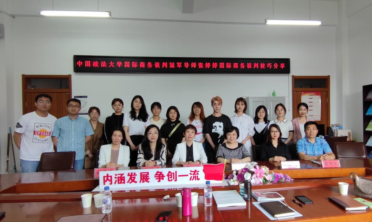 (本网讯)近日,中国政法大学商学院MIB教育中心主任宏结教授及国际商务系副主任张婷婷博士,应邀来果冻传媒 与果冻传媒 师生就国际商务专业建设和国际商务专业人才培养等领域进行深入交流。