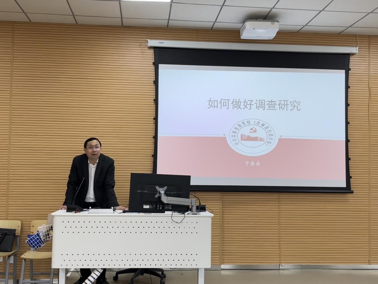 于会永副处长以《湖南农民运动考察报告》《长冈乡调查》《兴国调查》和《寻乌调查》等为例,紧紧围绕“如何做好调查研究”“如何进行调查研究”“如何写好调研报告”三个方面阐述了应当如何做好调查研究,他指出调查研究是党多年来从事革命斗争,国家建设过程当中运用的法宝。在如何做好调查研究方面,于会永副处长认为调查研究可以分为调查了解和分析研究两大部分,做好调查研究是为了深入了解事物的真实情况,掌握事物的本质和规律,透彻挖掘解决问题的思路和对策。调查研究具有两大作用,一是用于决策,领导自己调研自己用,二是建言资政,下级调研给上级用。在如何进行调查研究方面,于处长首先采用自身以往调研案例为大家生动地解释了调查研究过程中需要具备的“问题导向有的放矢、眼睛向下甘当学生、实事求是客观准确、系统思维掌握全貌”四个原则。其次他为大家阐述了如何运用“走马观花、下马看花、蹲点守花、山外寻花、动手栽花”的调查研究方法,最后他为大家总结了“确定主题、调研提纲、调研人员、调研地点、调研对象、调研时间”的组织调研方法,增强分析问题的能力。在如何写好调研报告方面,他提出四点建议:一、要第一时间掌握党中央、国务院重大工作部署和动态,并结合我省具体情况进行解读、解析。二、要聚焦重大问题深入研究。三、要在原有问题的基础上精细研究,有具体落实的举措。四、要借鉴外地好经验、好做法、新政策。