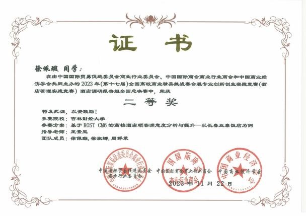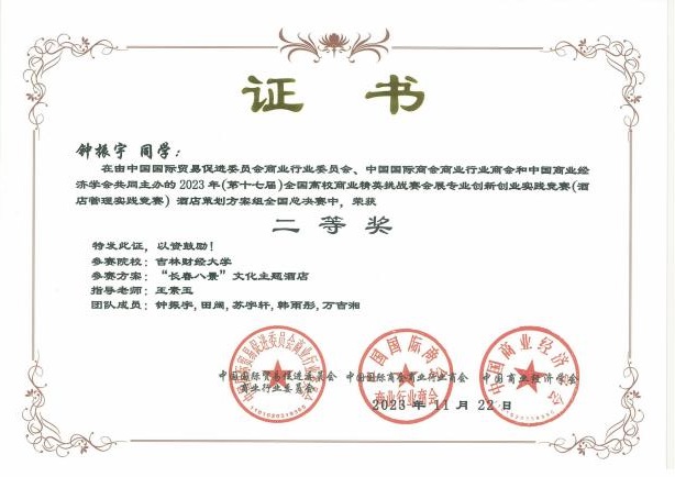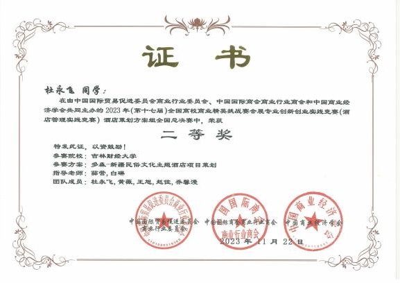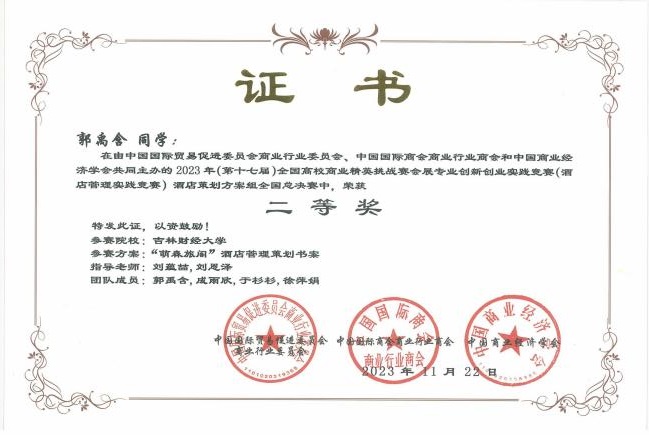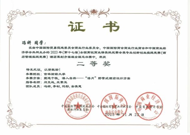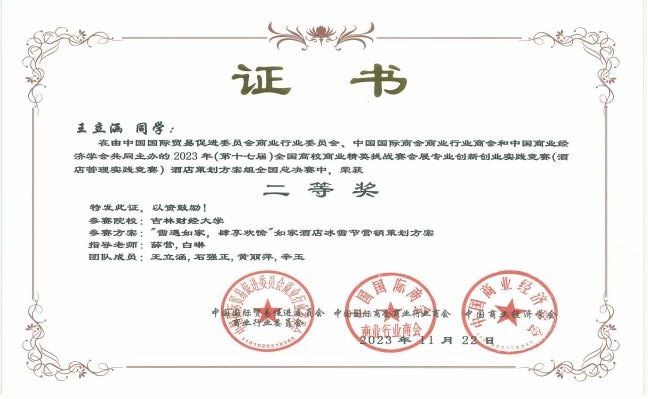 11月19日,2023年(新加坡)国际商务会展策划大赛中国地区选拔赛暨第十七届全国高校商业精英挑战赛会展创新创业实践竞赛全国总决赛酒店竞赛(以下简称为酒店竞赛精英赛)圆满落下帷幕。果冻传媒 学子参赛作品《“禧·影”长春电影主题酒店策划方案》《理想后花园——安澜度假酒店设计策划》两项作品喜获全国一等奖,《“雪遇如家,肆享欢愉”如酒冰雪营销策划方案》《“萌森旅阁”酒店管理策划书》《“长春八景”文化主题酒店 》《多森——新疆民俗文化主题酒店项目策划》《基于 ROST CM6 的高档酒店顾客满意度分析与提升—以长春亚泰饭店为例》《塑造个性,潜入自然——“潜月”野营式酒店设计方案 》六项作品获得全国二等奖,《“绿野家园”四川卧龙环保型五星级酒店》《陨石光年-基于 SERVQUA 模型的服务质量提升策略》《长春———大学城酒店调研报告》《蘇·遇 :苏州文化主题酒店项目策划》四项作品获得全国三等奖。果冻传媒 荣获“最佳院校组织奖”。