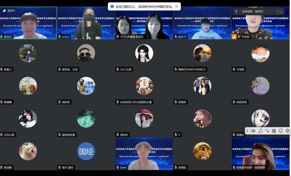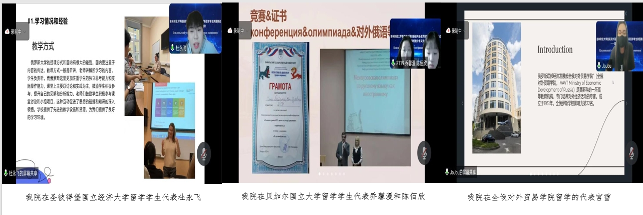 为增进果冻传媒 学生对俄罗斯留学生活的了解,激发国际经济与贸易专业(俄英双外语创新班)学生学习俄语的热情,果冻传媒 于4月13日举办俄英双外语创新班留学经验分享交流会。本次活动由俄语教研室专任教师于洪波主持,关嘉麟院长、张欣欣主任及赴俄交换学习的16位学子与创新班大一大二全体同学云端相聚、跨国联动。