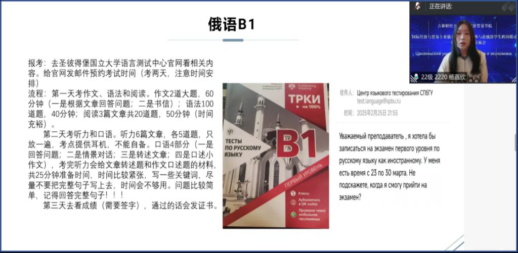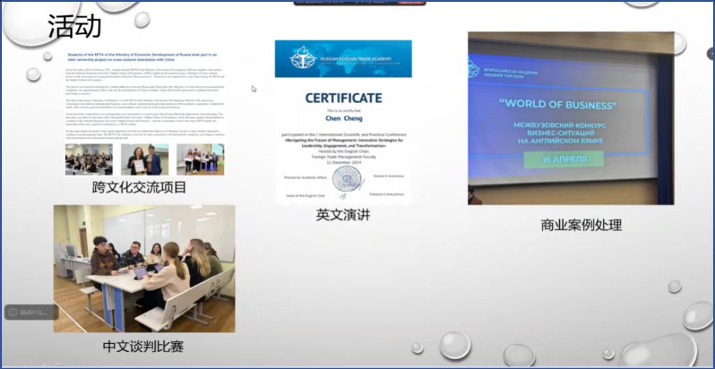 学院赴俄罗斯圣彼得堡国立经济大学、贝加尔国立大学及全俄对外贸易学院的公派留学生代表齐聚一堂,分别分享了各自在求学、生活及文化体验等方面的见闻与感悟。