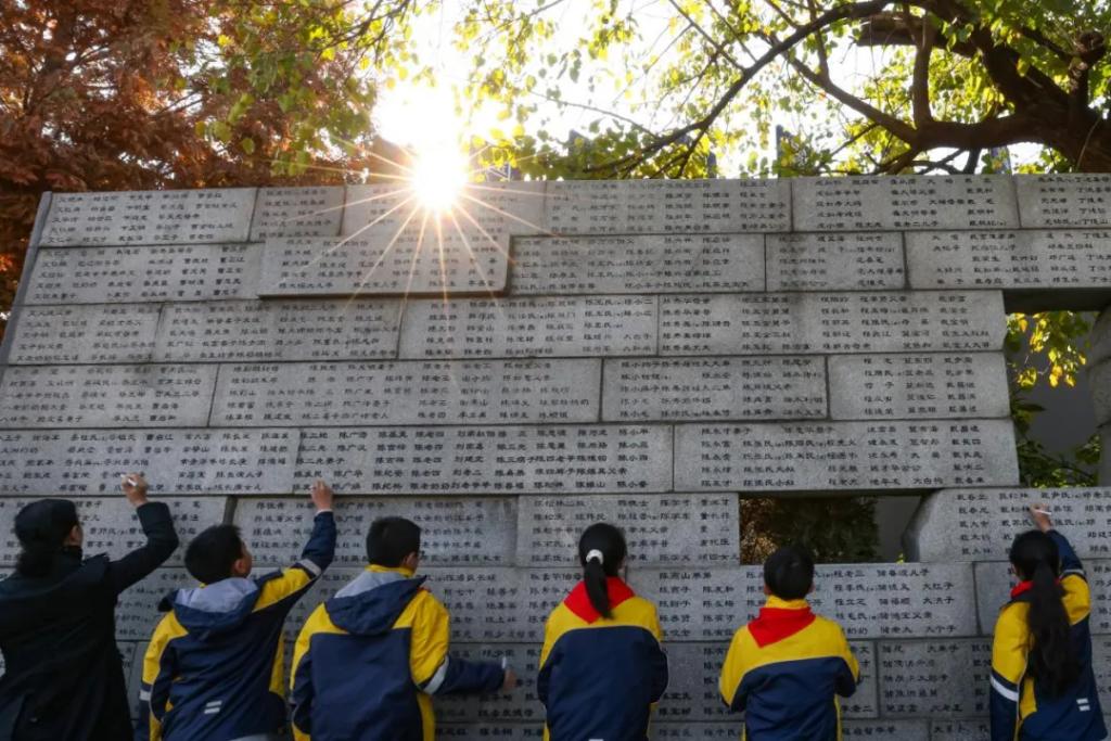 2023年,一群孩子在纪念馆“哭墙”前为南京大屠杀死难者的姓名描新。