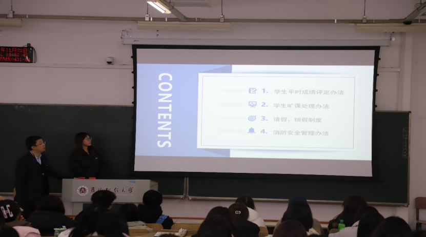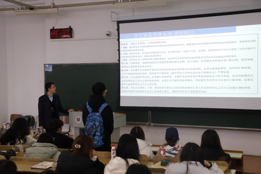 针对这些问题,王萌老师带领同学们共同学习了学生手册中关于“学生平时成绩评定办法”“学生旷课处理办法”“请假、销假流程”等相关制度和要求,并表示学院学生工作办公室将进一步加强学风建设的过程管理,希望同学们能加强自我管理,共同营造良好的学习氛围。