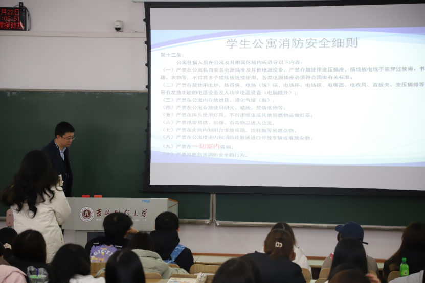 校园安全工作会议上,王萌老师为大家详细解读“果冻传媒 校园治安防火安全管理制度”并结合学校部署作出具体安排。他强调班干部、寝室长要负起责任,禁止在寝室使用违规电器,禁止在一切公共场合吸烟,把隐患消灭在萌芽状态,最大限度保障学生安全。寝室长是寝室安全防火的第一责任人,因此更要加强要求,每日的网格化上报中除汇报返校情况外还要增加与寝室安全防火检查相关的汇报内容。