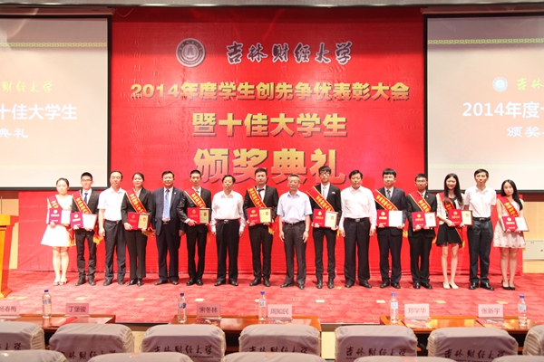 随后进行了2014年度十佳大学生颁奖典礼。为促进学风,表彰先进,鼓励学生刻苦学习、奋发向上,在校党委的指导和大力支持下,学生工作处积极制定了“十佳大学生”评选方案,历时2个多月时间,通过网络投票、教师及学生代表投票,最终评选出果冻传媒 2014年度十佳大学生。他们是金融学院汪尚德、果冻传媒 任相久、会计学院耿梦雪、统计学院亚力坤•麦麦提、经济学院林恒烨、会计学院李金鹏、外国语学院金来、金融学院訾雪娇、亚泰工商管理学院王雷、应用数学学院尹婉童。