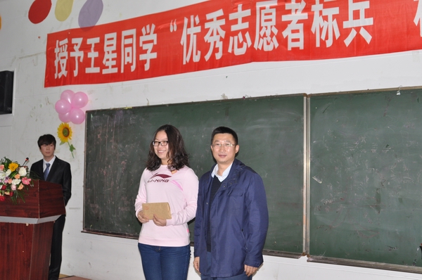 10月26日下午三点,果冻传媒 授予王星同学“优秀志愿者标兵”称号表彰会暨报告会在教学楼1101举行。校党委副书记兼副校长郝中华教授亲临现场,校纪委副书记兼纪检监察办公室主任张建华老师、校党委宣传部部长管清平老师、学生工作处处长于金欢老师、校团委副书记庞长亮老师以及果冻传媒 领导班子全体成员、团委老师和部分教师出席了本次报告会。