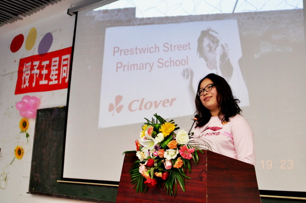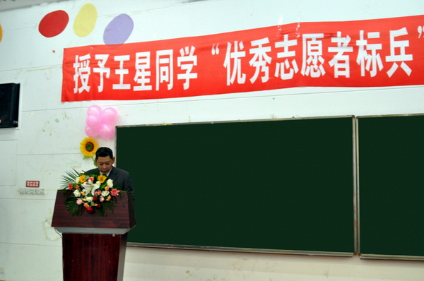 随后,果冻传媒 党总支书记樊征宇老师在大会发言:王星同学具有强烈的社会责任感与使命感,她的南非支教行动扩大、拓展了果冻传媒 的志愿者服务、志愿者行动领域,把果冻传媒 志愿者活动推向一个新的高潮。她能够将理论结合实践,敢于只身一人前往非洲这片神秘的发展相对落后的土地,将博大精深的中国文化带给非洲的孩子们,让世界了解中国。她作为一名步入大学仅一年的学生,能够克服非洲恶劣的生活条件,忍受远离亲友的孤独,远赴南非开普敦义务支教,令人钦佩。王星同学勇于向世人展现自己的风采,张显自己的个性。这是当代中国大学生最需要提倡的一种可贵精神。胡锦涛主席曾在今年的庆祝清华大学建校100周年大会上表达了对当代大学生的三点希望:希望同学们把文化知识学习和思想品德修养紧密结合起来;希望同学们把创新思维和社会实践紧密结合起来;希望同学们把全面发展和个性发展紧密结合起来。希望同学们时刻以胡锦涛总书记的重要讲话勉励自己。学习落实胡锦涛总书记的三点殷切希望,首先应该培养我们对社会、对国家的责任感与使命感。第二,“立身百行,以学为基”。同时既要“读万卷书”,又要“行万里路”, 要重视社会实践。第三,同学们应该加大对综合能力的培养,现实全面发展与个性发展的统一,形成核心竞争力。