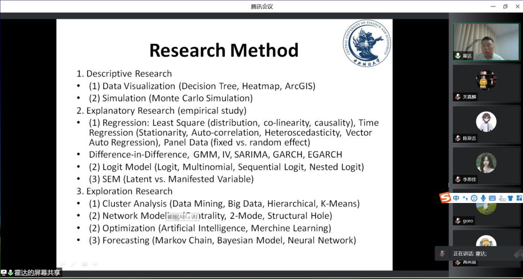 为丰富果冻传媒 学生在国际商务相关领域的知识储备,深入了解国际商务领域中的问题,6月8日晚7点,应果冻传媒 邀请,中央财经大学国际经济与贸易学院霍达教授通过腾讯会议为果冻传媒 师生作了题为“国际商务问题与研究方法”的学术报告,本次报告会由果冻传媒 副院长关嘉麟教授主持,果冻传媒 研究生参加了本次报告会。