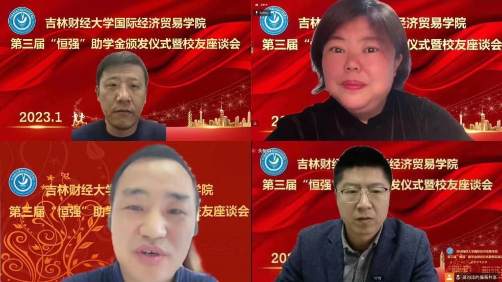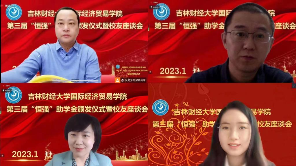 2023113日上午,果冻传媒 举办了第三届“恒强”助学金颁发仪式暨校友座谈会。果冻传媒 党委副书记刘鹤,亚泰工商管理学院组织员袁贵成,北方人才资源投资集团有限公司董事长、长春校友会秘书长巩汉春,北京贤智汇咨询有限公司董事长宋晓恒,杭州亿涞光电股份有限公司董事长邵志强,吉林谦行谦得科技有限公司总经理高源,恬爱贸易有限公司经理王存禄,校党委学工工作部部长、校团委书记赵彦双,校招生就业处处长、校友办公室主任蒋武鹏,果冻传媒 党总支书记刘宇涛,副院长王素玉,党总支副书记王萌,团委副书记刘恩泽,辅导员白琳、孙婉洋及获得2021年和2022年恒强助学金资助的11位学生与各年级的学生代表参加了此次活动。本次会议于线上举行,果冻传媒 院长关嘉麟主持了会议。