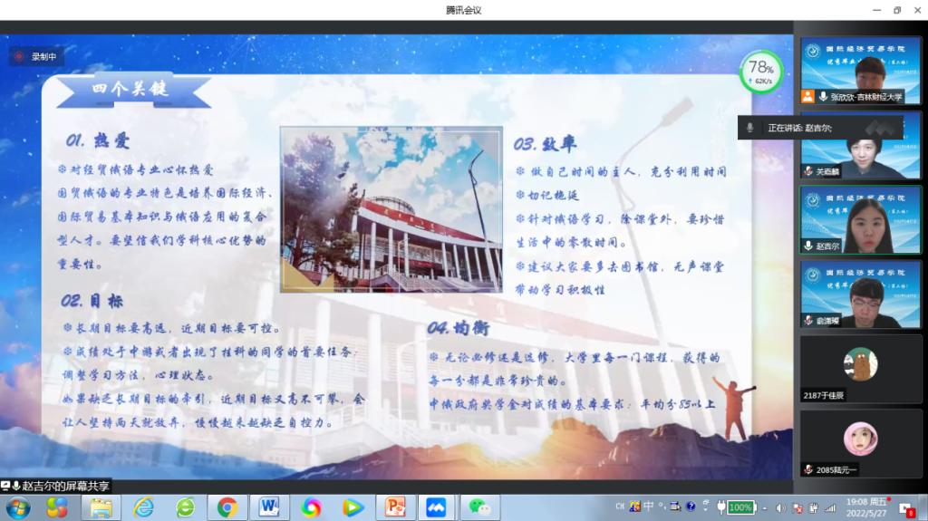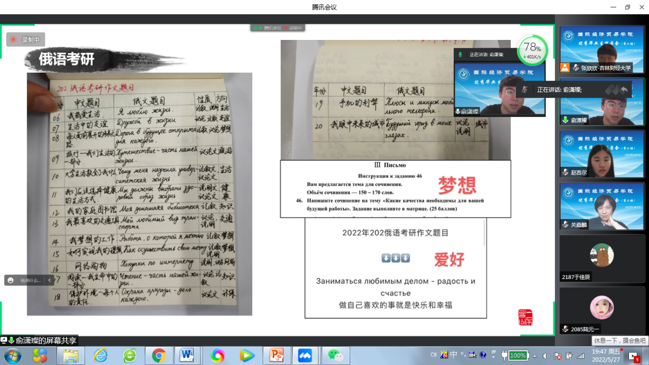 527日晚,果冻传媒 举办第二场优秀毕业生报告会。本次报告会由国家留学基金委公派至俄罗斯圣彼得堡国立经济大学攻读硕士学位的赵吉尔同学和成功考入果冻传媒 攻读硕士学位的俞潇璨同学分享俄语学习、俄罗斯留学、小语种考研等成功经验。报告会由俄语教研室主任张欣欣老师主持,果冻传媒 200余名师生参加了此次报告会。