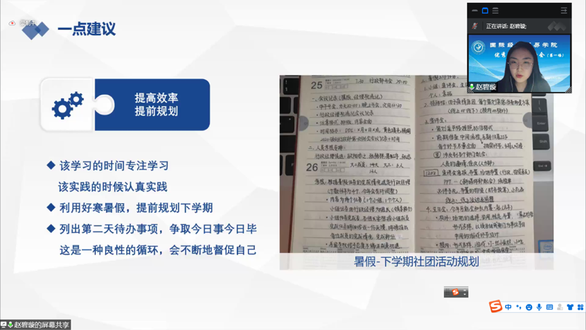 报告会上,赵碧璇学姐从“学生工作”“比赛经历”“学习规划”“个人建议”四个维度分享了丰富多彩的本科学习生涯。她鼓励学弟学妹,要根据自身规划、自身兴趣,以及能力水平加入适合自己的社团,积极参加学科竞赛等各类比赛,通过各项赛事的不断磨练,提高实践能力,增加阅历;赵碧璇运用可视化表格精准编制成长规划,建议大家从大一开始就给自己制定目标,脚踏实地一步一个脚印追寻梦想。朱桦学姐分享了自己考研成功上岸的经历,详实介绍了各个科目的学习经验。她特别指出:“条条大路通罗马”。在确定目标前,一定要作综合考量,确定基于较强的自我驱动力才选择考研,而非单纯受外界环境和声音的影响。面对不确定的未来的时候,不要一直憋着、自己内耗,要多跟老师和学长交流,保持平常心,保持好节奏,将路径具体化,一定能够实现目标。